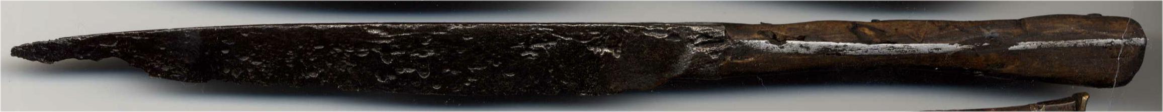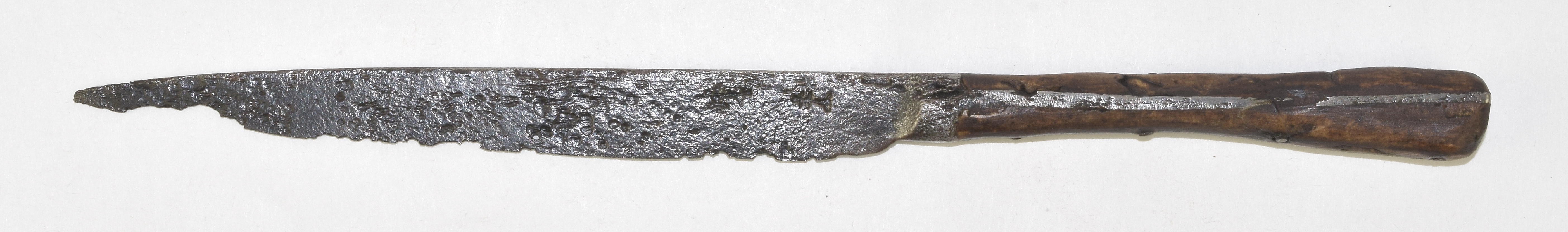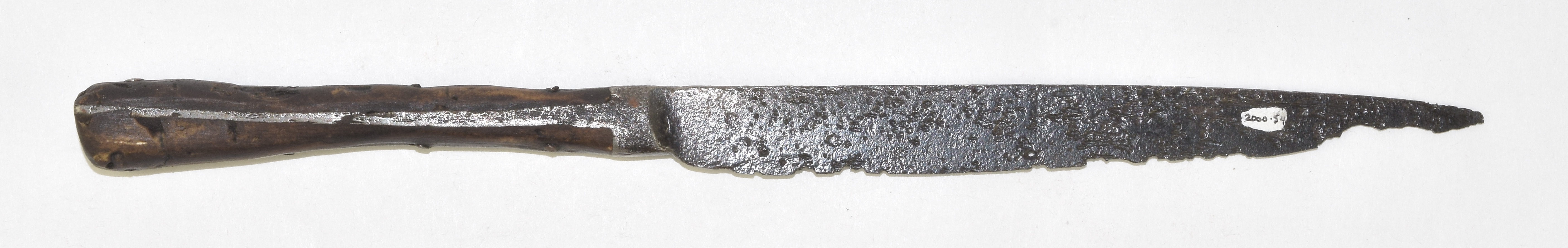 Knife with integral bolster and a horizontal strip tang. This is very similar to many early knives, but the tang is not in the plane of the blade - instead it is 90 degrees off. With halberd and chess piece marks, wooden scales. Scales secured by four iron pin rivets.