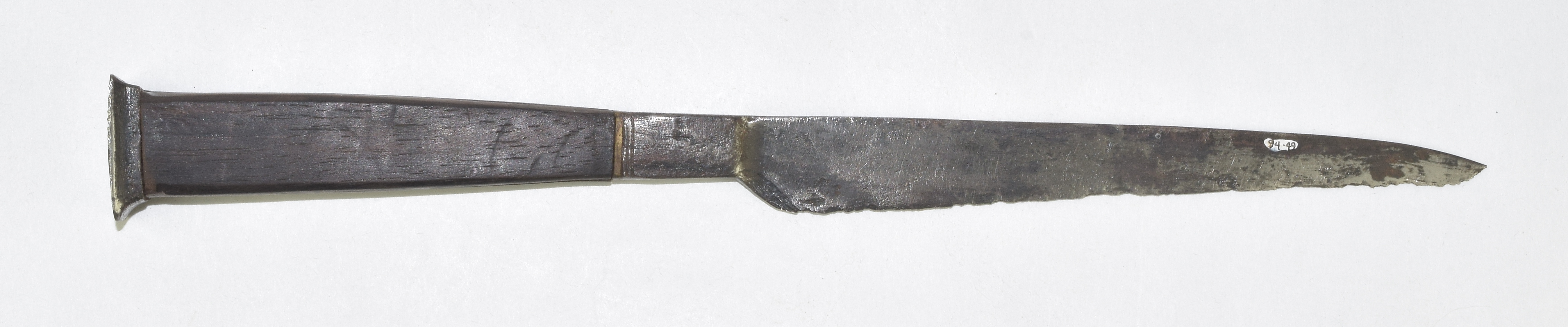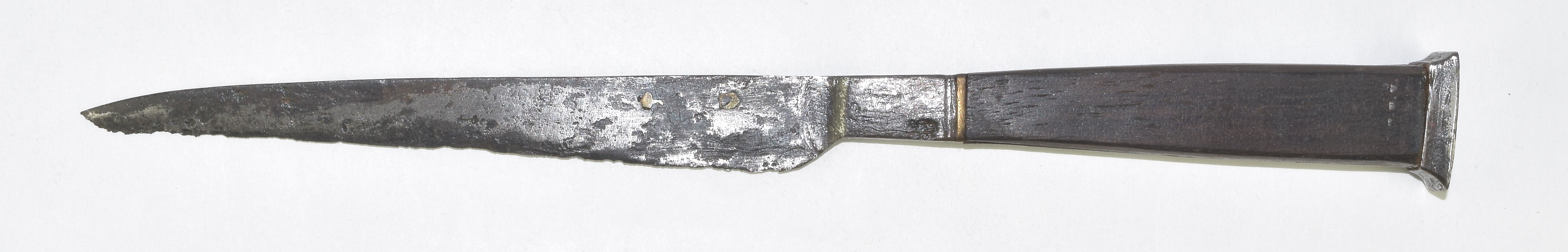 Good integral iron bolster and attached pommel. Brass spacer between bolster and handle. Brass ovelays on the edges of the tang. Flaired iron finial. Wood scales most likely replaced. Cutler's double mark inlaid with copper alloy. Ex. Col. Simon Moore #94.49