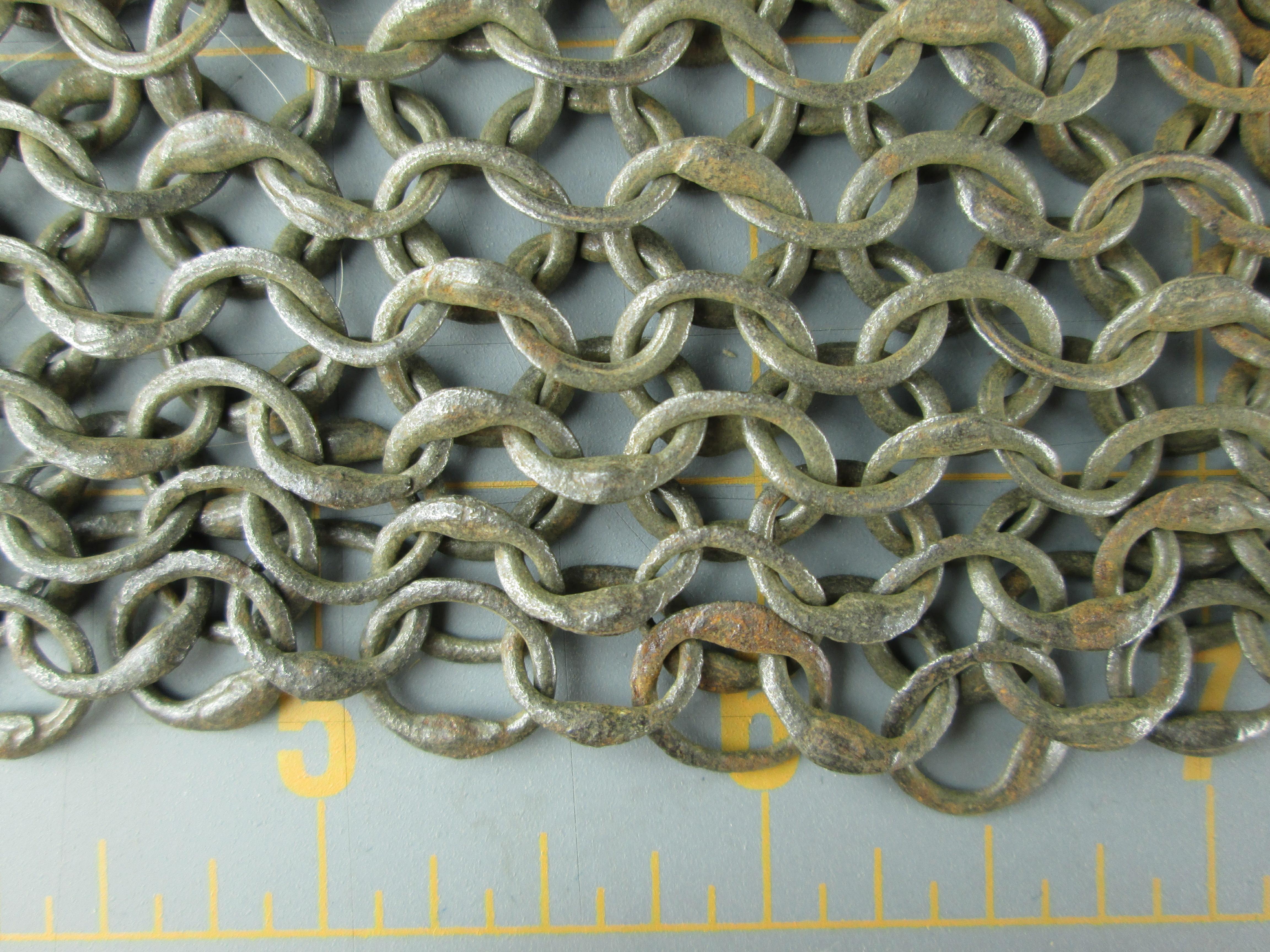 European. Mail Shirt hip length with short sleeves and collar. Open at the center of the neck. Rings of flattened form, entirely riveted. Wedge rivets. Collar of slightly heavier rings somewhat more crudely made. The rivet heads on the collar on the opposite side. This indicates the collar was added, almost certainly during the working life of the shirt. The body is formed of slightly heavier rings than the bottom border, the ends of the sleeves are even lighter. There is one row of solid rings around the bottom. The shirt is tailored in the back in two lines. These lines start over the shoulder blades and drop rings down to the waist and then down to the top of the shoulder. There are also some expansion rings in the lower center of the back. The main lines of expansion and contraction add and drop 10 rings on each side. The later images showing marking shows most of these, I later found the additional expansions which are illustrated in the first set of images. This provides a lot of extra material over the shoulder blades which would allow for good forward movement. The front is not tailored in the same way. The armpits include cross-joined links, the details of which are somewhat unclear due to losses. The images with flags indicate the locations of the expansion rings. They point in the direction of expansion. The main rings have an oval form. It appears that the main rings in the main body are app. 5/16 x 1/4 in. ID. The smaller, thinner ones along the sleeve edge are app. 1/4 in. ID and more round.
