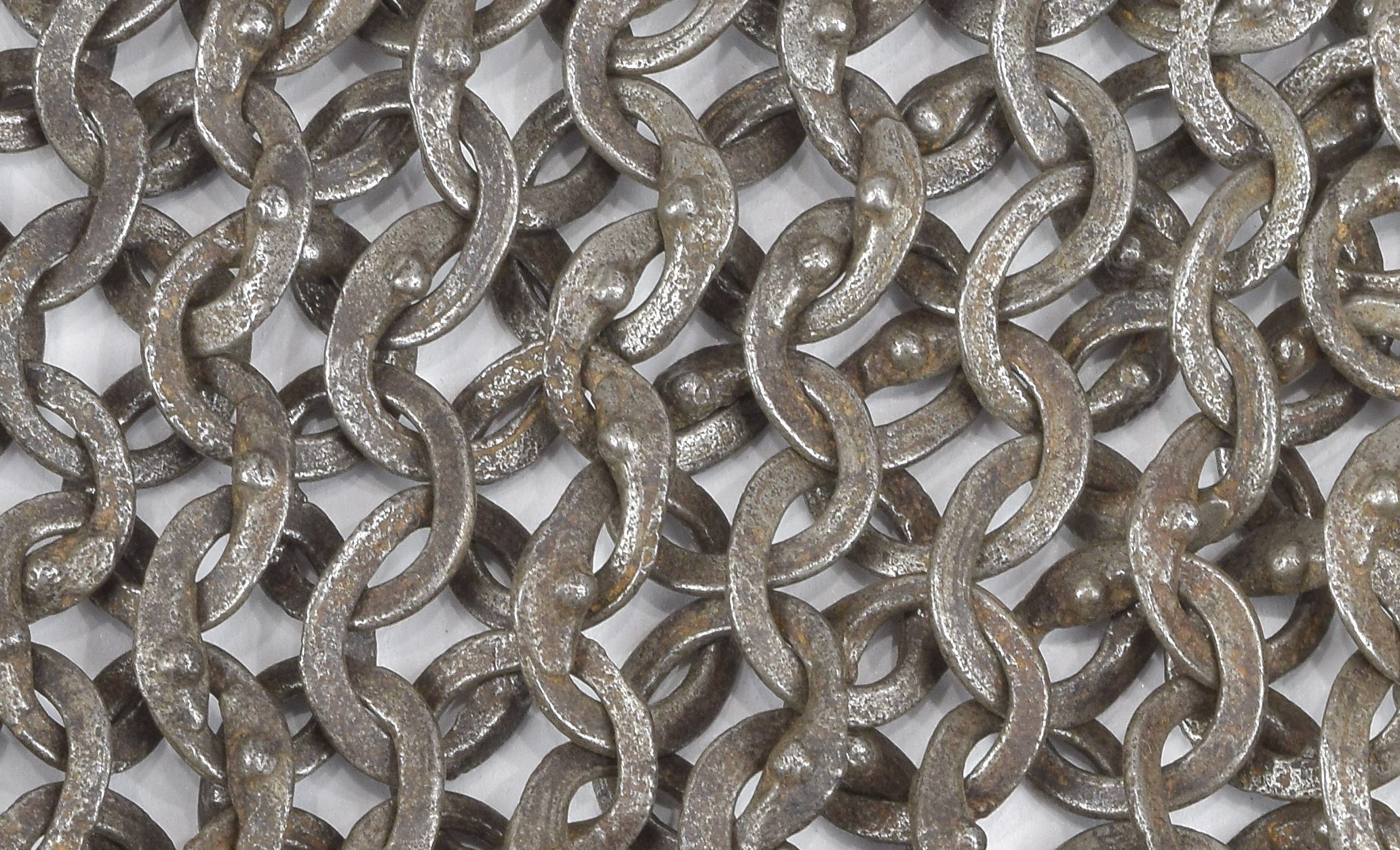 European. Crotch length body with long sleeves. Opens in the front. Sleeves with elbow bends and tapers in the upper arm and forearm. Arms joined to the body with a row of cross-linked rings at the armpit. There are 13 rings in the body connected by 7 cross-linked rings to 8 rings in the sleeve at this join. Tailored in the back to the shoulders with expansion from the shoulder to the shoulder blades and taper back to the waist. Small extension to the center back that can be pulled up and connected to the short section at the bottom of the left side to form a brayette. There is some expansion leading to this extension that allows the mail to fit to the buttocks. Right sleeve with a narrow cuff formed of 5 rows of much finer mail formed of round wire with wedge rivets also forming a pent roof. Formed of large mostly flat slightly oval rings, secured by wedge rivets with pent roof form at the overlaps. Rings tapering in size somewhat in size from the chest to the wrists and skirt. Some old repairs, assembly or modifications with smaller riveted links. Some minor areas of repair with modern butted links. Left forearm appears to be patched with a forearm from another shirt or sleeve as the wrists don't match and there seems to be one almost full row of butted rings. The repair is formed of nearly identical rings with correct taper, so was from an appropriate piece, not just a random swatch. Tailoring in the back of the body consists of 9 expansions on each side at the shoulder which then lead to 9 contractions back to the waist (10 on the left side). There are two additional rings in the center of the back that provide additional contraction, and two more near inside the base of the right contractions. There appears to be one spurious expansion as well. Below the waist, just right of center, there is a single line of 8 expansions which would allow the piece to fit to the buttocks. The shoulder expansions add a ring every even row. The contractions remove one every other even row, then the below waist expansions are also every other even row. There is also tailoring in the front of the shoulder. There are 7 expansions on the left and 9 on the right. The cross grain join at the armpit is 7 rings long (counted on the left). Expansions are marked with white flags, newer images at the top show the most complete map, lower images were taken earlier, before all tailoring was found.
