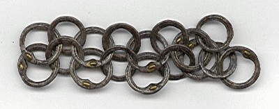 Small piece of Mail. Each ring stamped with parallel lines. Rectangular rivets of copper alloy.