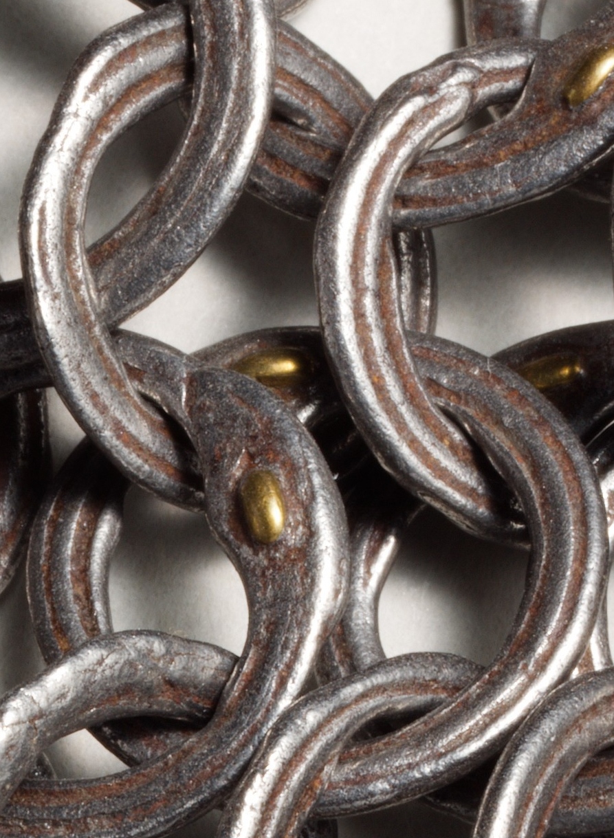 However, copper-alloy rivets remained in use far longer in Indo-Persian mail. Further, the use of rectangular rivets (David Edge has referred to these as "slotted" rivets) seems to be a feature peculiar to Mamluk mail. Compare MET 14.99.28 illustrated in the second image.