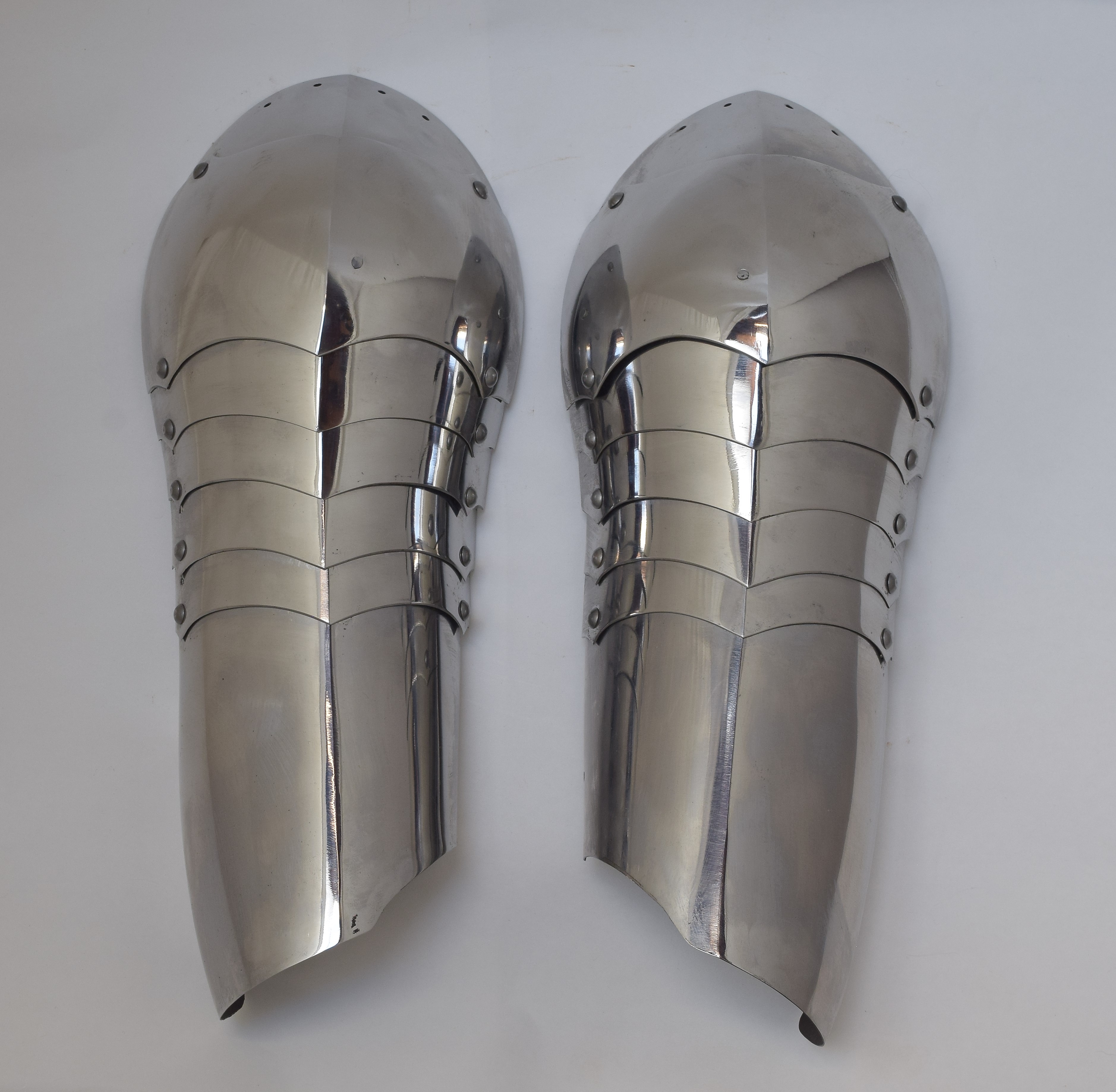 Of simple "Gothic" form typical of the work from Innsbruck. Patterned after those on A20 in the Wallace and other similar surviving shoulders, not intended as a direct copy of any of them. The primary source was A20, but some others have more interesting sweeps in the overall form - this has been incorporated. The top plates are attached to the main plates with sliding rivets at the front and back. The lower plates are secured by sliding rivets at the back and leathers are the center and front. They were sized to fit me. They are illustrated when first finally assembled, they still need leathers and a buckle. The other image shows the initial full sized sketches drawn to work out the form in detail with the rough bolted together pieces. The drawing on the left includes the intended overlaps. The drawings have enough detail that I was able to derive the patterns directly from the drawings. Made by Wade Allen in 2023. Hardened and tempered 1050.