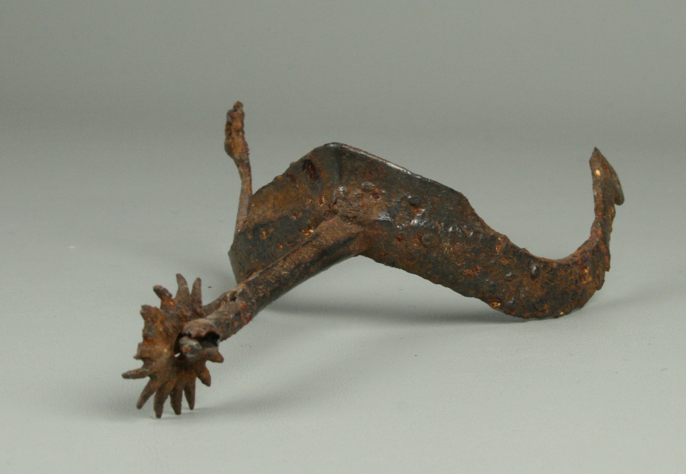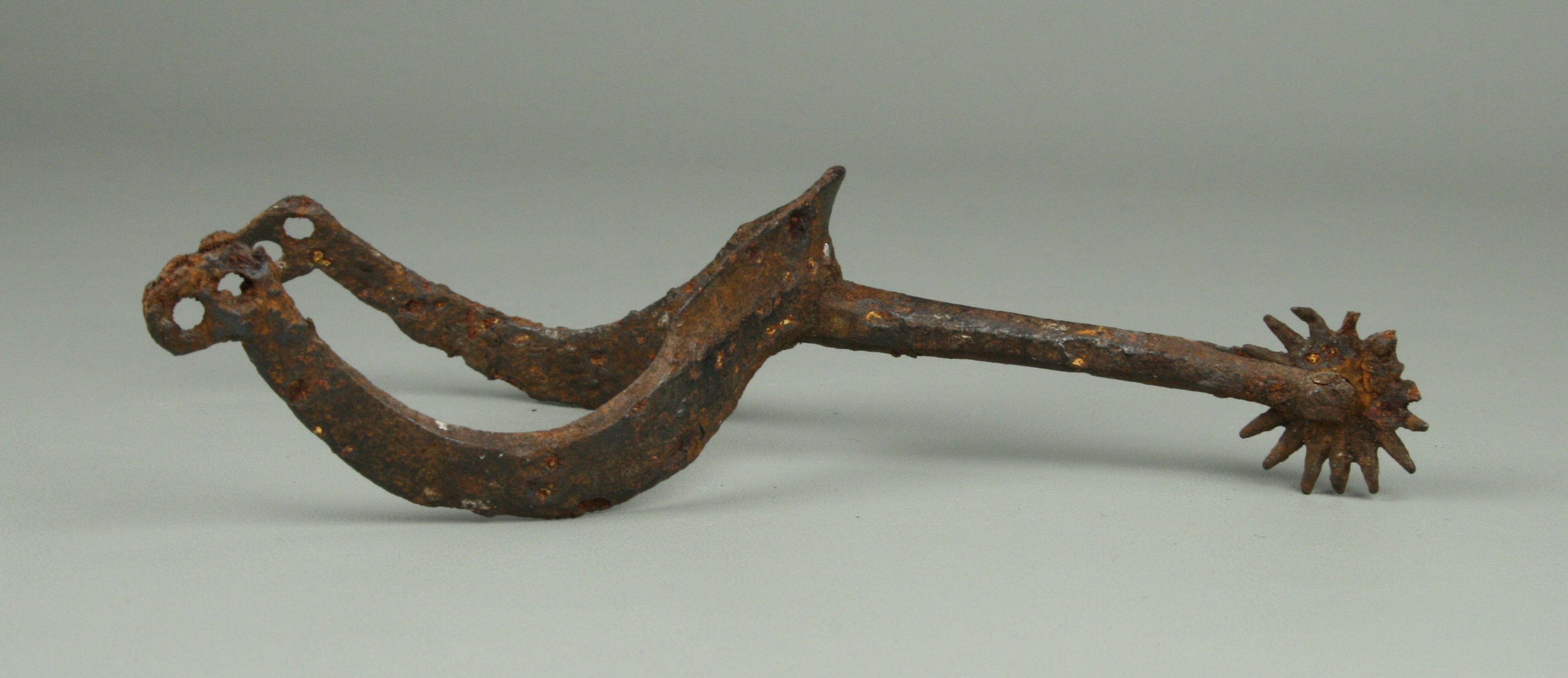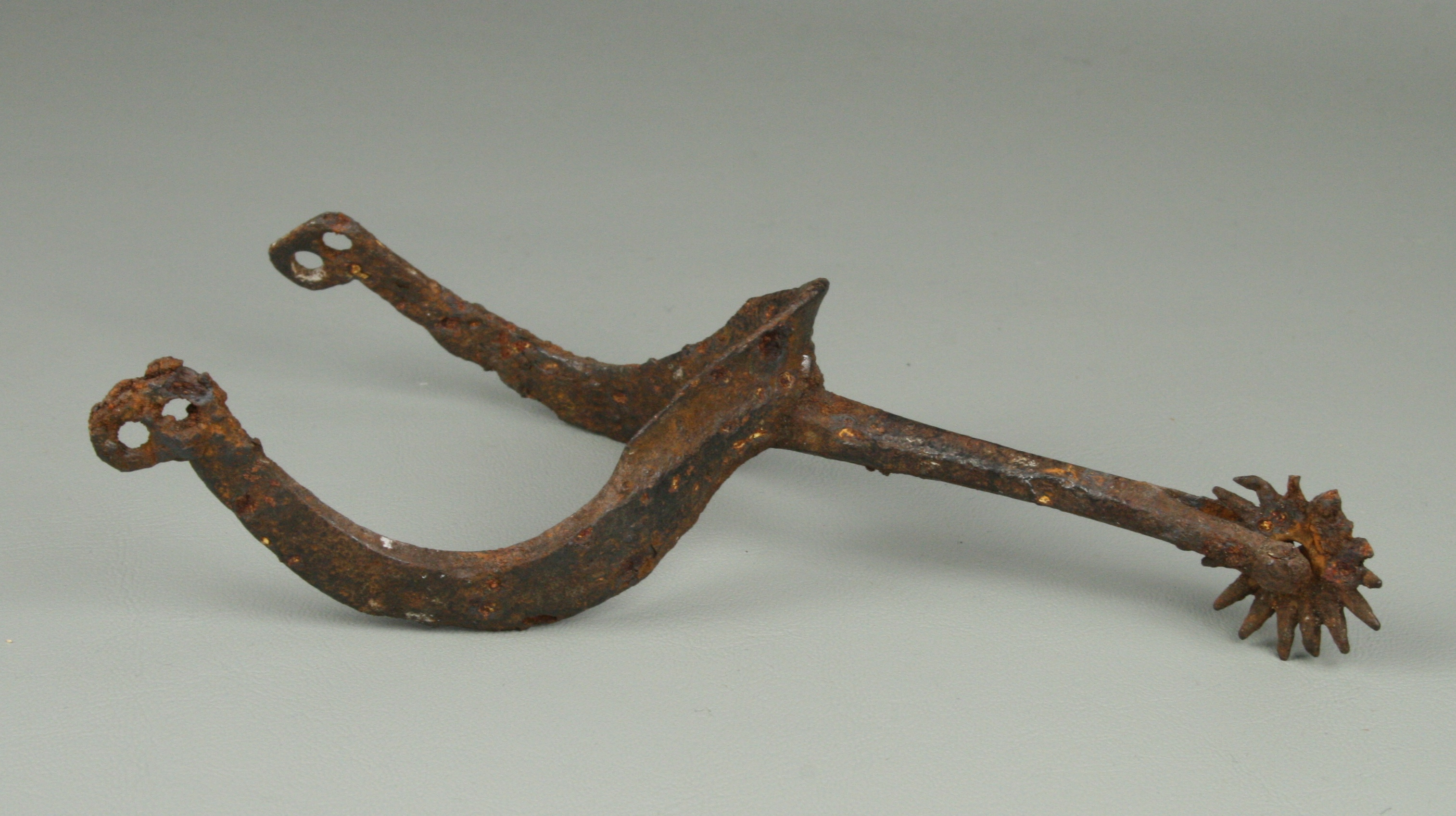 Spur. Curved mostly flat profile arms. medium stalk of roughly hexagonal form tapering toward the rowel. Small multi-pointed rowel. Figure 8 terminal on each side. Excavated in Germany.