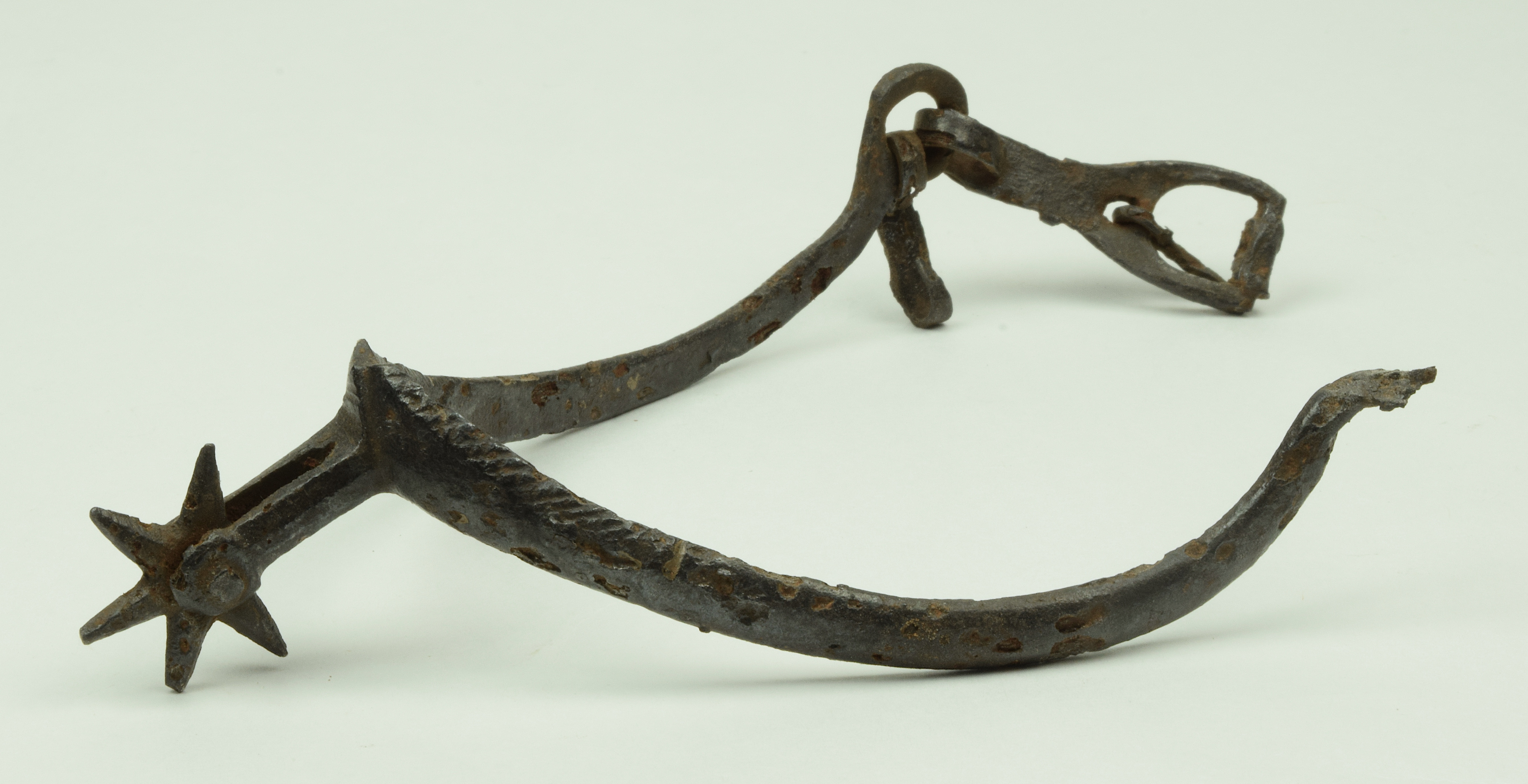 Spur. Curved arms. Cross-hatched file decoration on the upper facet of the center of the body. Small six pointed rowel. single figure 8 terminal. The other terminal would have been a vertial slot. buckle and strap mount remain on the extant terminal. Buckle is formed with an integral mount and retains its tongue and roller. The strap mount is relatively narrow and plain with some file decoration. Excavated in Germany.