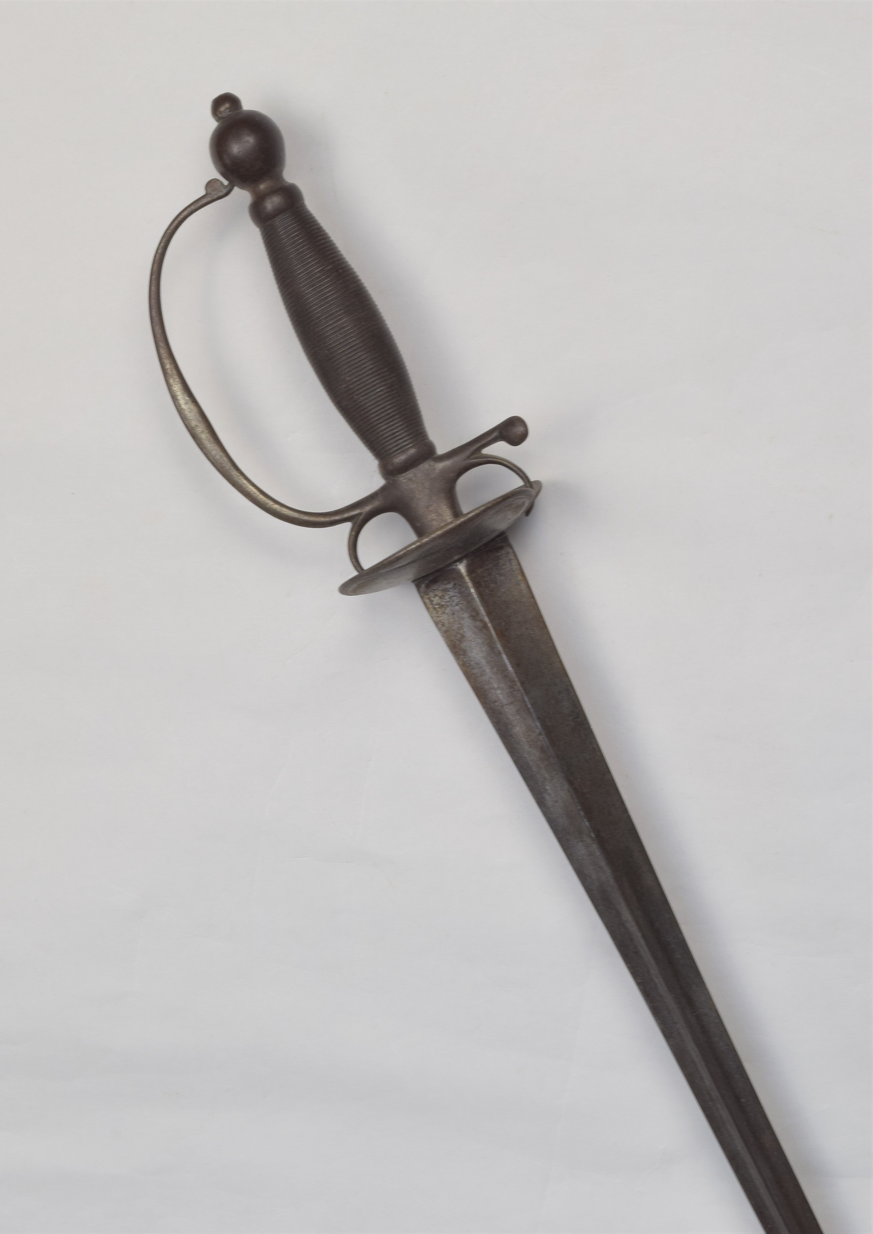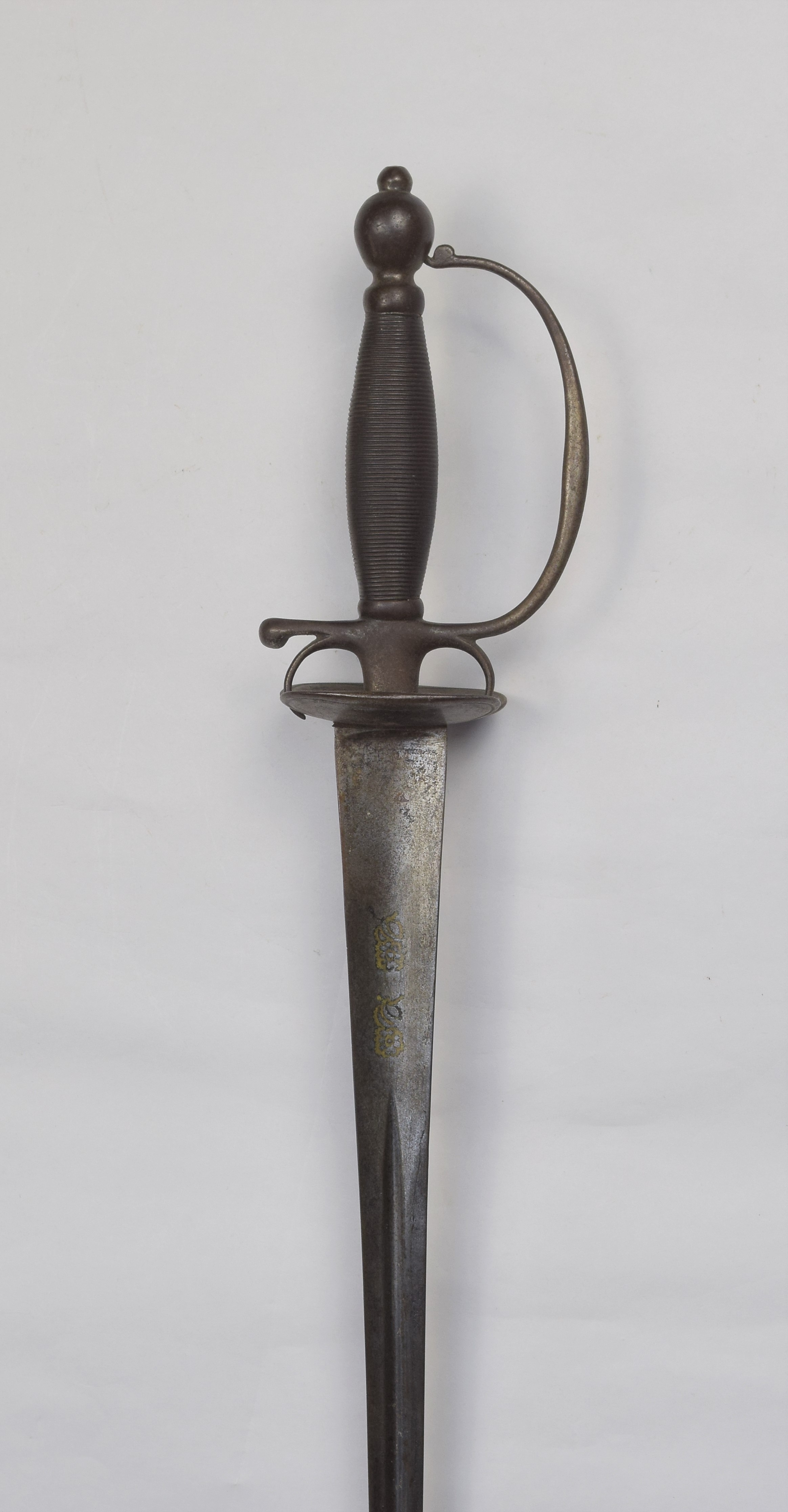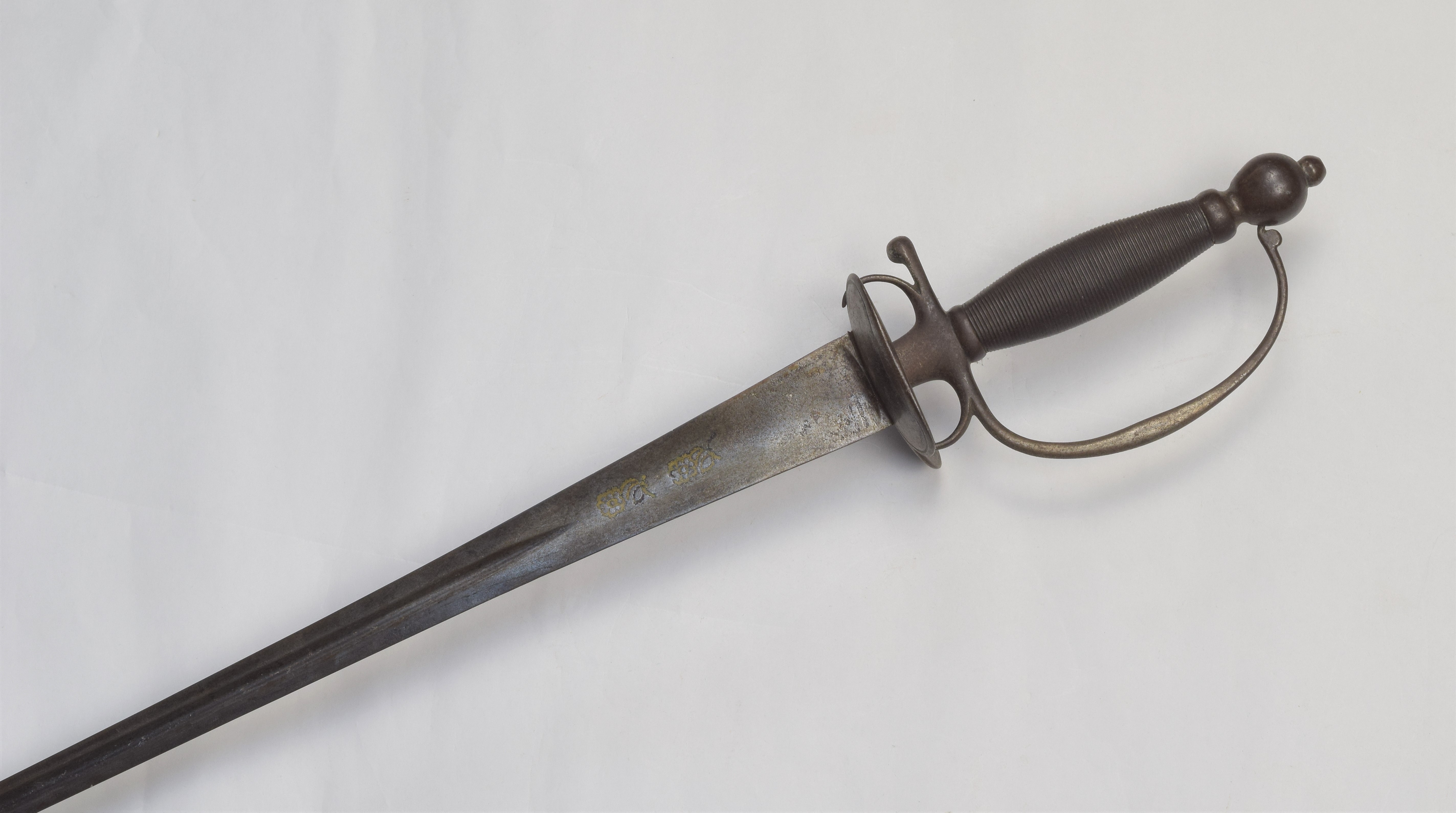 Small sword. Steel hilt. Wire-wrapped handle. Wide triangular blade. Inlaid roses (probably a mark) on the back of the blade.